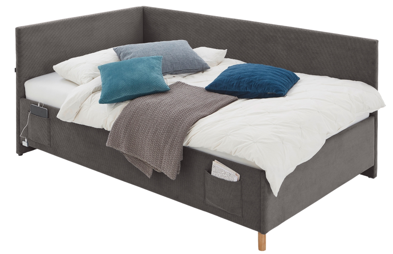 Stylová postel Cool s manšestrovým čalouněním je skvělou volbou pro dětské i studentské pokoje. Na jejím boku najdete prostorné kapsy, do kterých se vejde vše, co bude potřeba mít před spaním po ruce – knížka, časopis, herní konzole i drobné hračky či brýle na čtení. Dalším praktickým detailem je zabudovaný výstup pro USB i USB-C, díky kterému je možné nabíjet telefon, MP3 přehrávač nebo třeba hodinky. Postel Cool je navíc dostupná ve čtyřech barvách, ze kterých si vyberou kluci i holky. K dostání je také varianta bez bočního panelu.