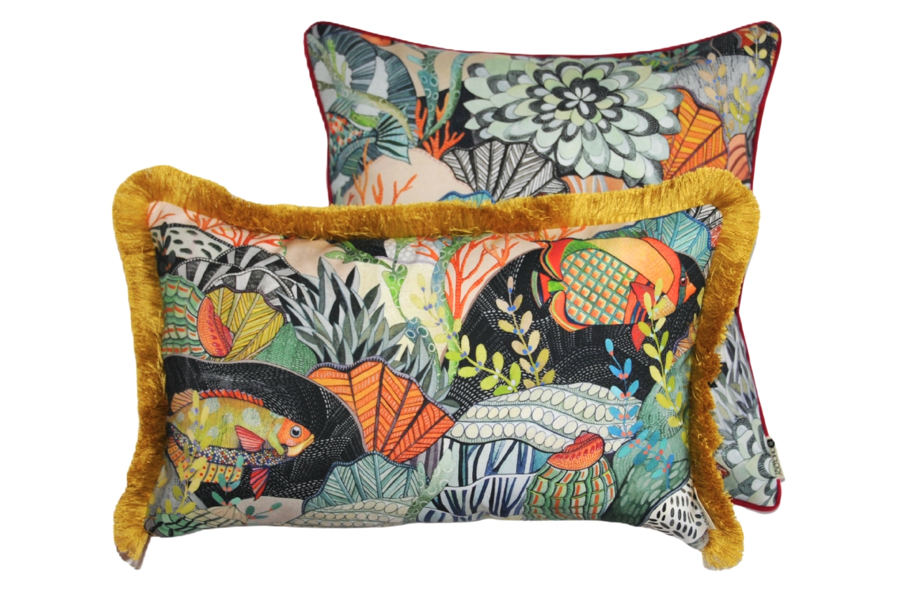 Set dvou povlaků se skládá ze série Marine od české značky BOHOLOGY, která je vyrábí z kvalitních anglických látek Osborne&Little. Ty se vyznačují výraznými barvami a nádhernými vzory, které vznikají pod rukama světových návrhářů. Povlaky mají motiv podmořského světa, přičemž první je o rozměrech 30 x 50 cm a jeho okraje lemují zlaté třásně. Druhý povlak je čtvercový s 45 x 45 cm. Druhá strana povlaků je modrozelená, takže pokud zatoužíte po změně, můžete polštáře kdykoliv otočit a vzor tak na chvíli skrýt. Jsou vhodné do interiéru i exteriéru, kde snesou i náhlý letní déšť. Po straně mají zip, díky čemuž se dají jednoduše sundat a vyprat.