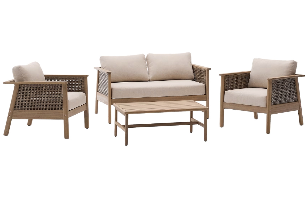 Popis produktu Dřevěný zahradní set pohovky, křesel a stolku Kave Home Alabe