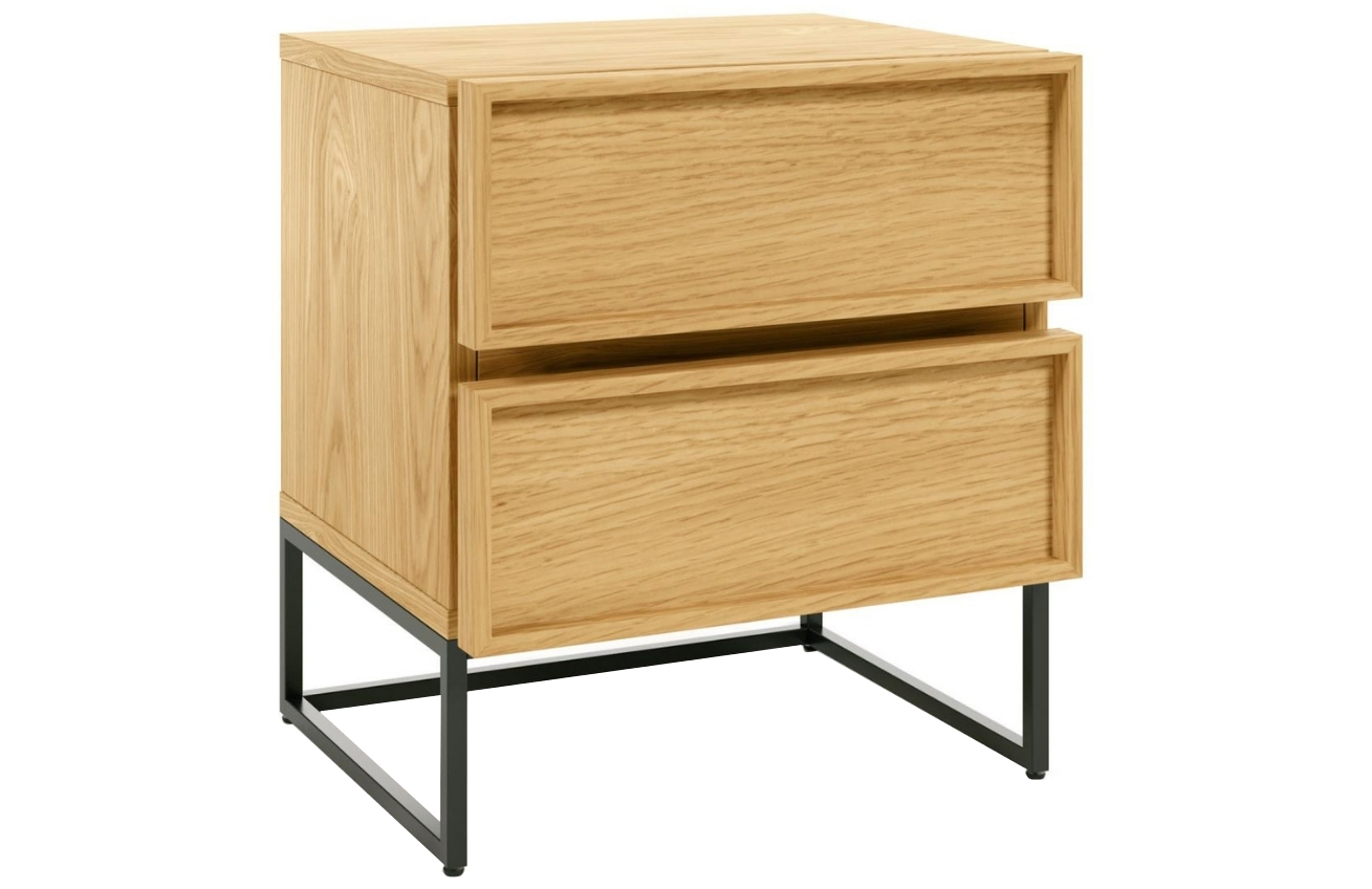 Dřevěný noční stolek Taiana od značky Kave Home na první pohled zaujme svým atraktivním a nevšedním designem. Korpus stolku z dubové dýhy doplňuje podnož z černě lakovaného kovu a díky tomu vzniká zajímavý kontrast. Odkládací prostor umožňují dvě zásuvky se systémem zavírání soft close. Noční stolek Taiana bude perfektním doplňkem pro ložnice s přírodními prvky.