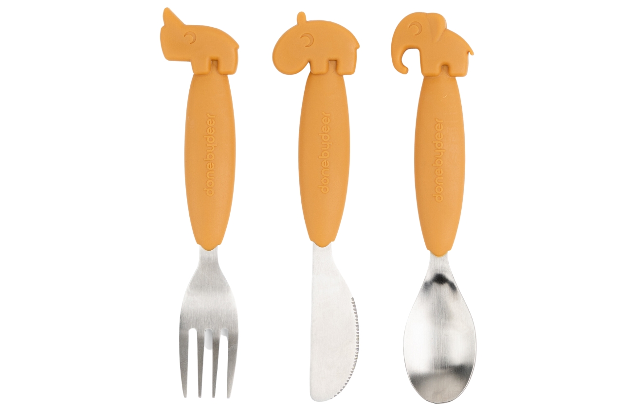 Popis produktu Hořčicově žlutá silikonová sada příborů Done by Deer Deer friends