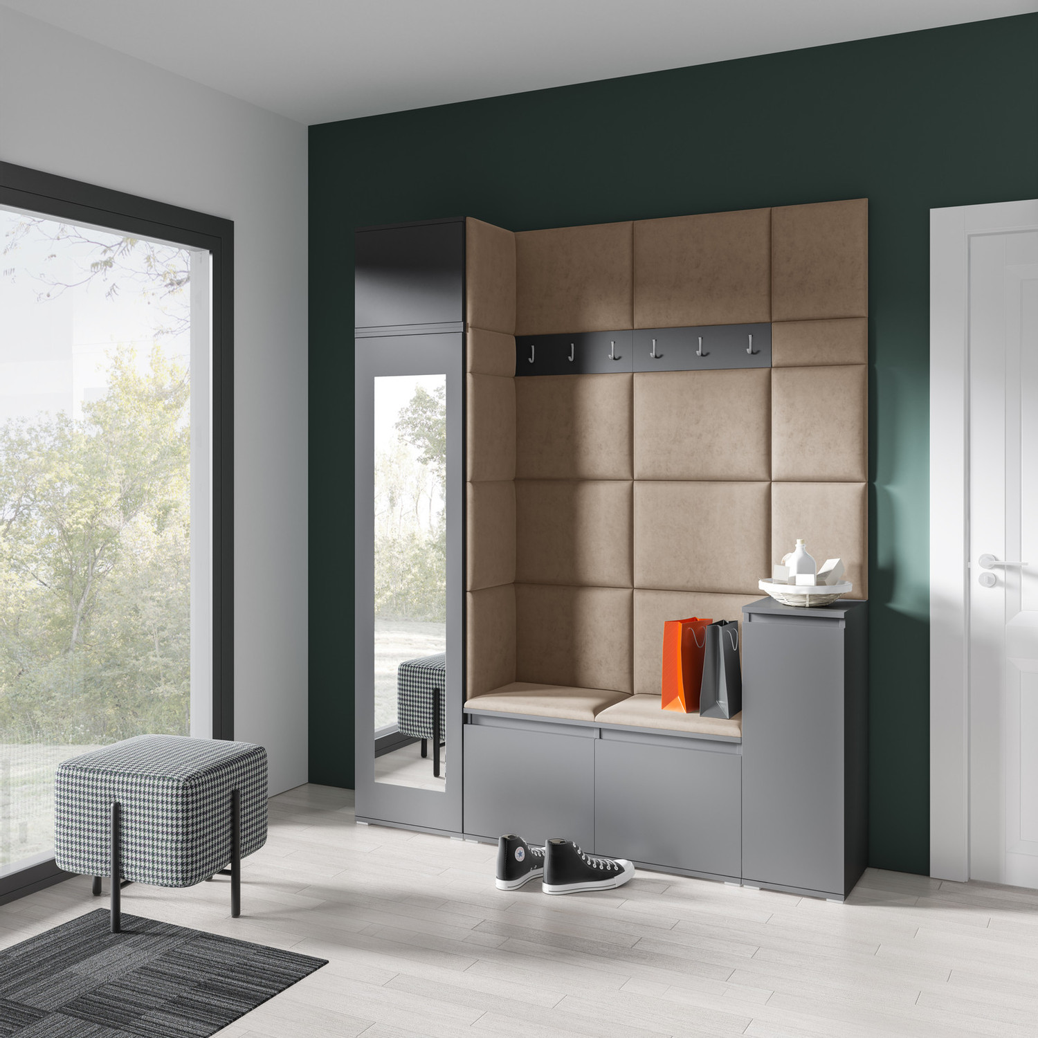 Předsíňová stěna AMI 29, je moderní a praktický prvek do vstupních prostor vašeho domu. Předsíňová stěna obsahuje devatenáct čalouněných panelů, které se montují přímo na stěnu za pomoci lepidla. Potah botníku je tkanina TRINITY, která je měkká a příjemná na dotek. Jedná se o velurovou tkaninu. Předsíňová stěna se skládá z několika částí. Údržba: Vyhněte se použití chemikálií. Lepidlo není součástí balení.Naše výhodné nabídky čekají právě na vás. Lepší nabídku už na trhu hledat nemusíte.