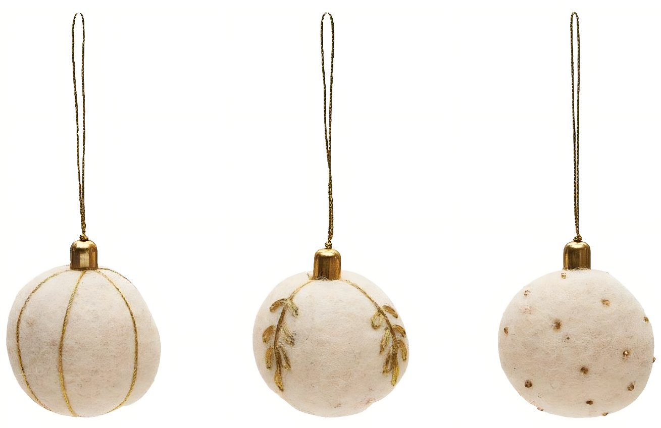 Popis produktu Set tří bílých plstěných vánočních ozdob Kave Home Breshi 5 cm
