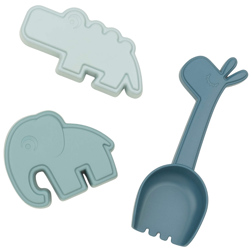 Modrá sada tří plastových hraček na pláž nebo na pískoviště zabaví každého raubíře. Krokodýl, sloník i žirafa budou skvělými kamarády na zahradu i k moři. Lopatka a formičky jsou krásným dárkem a potěší každého.