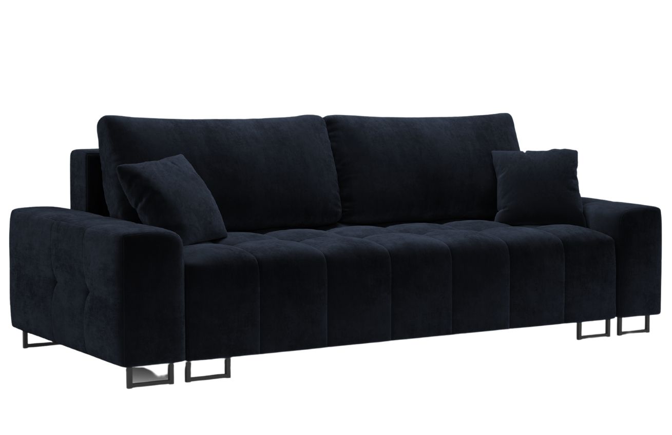Popis produktu Tmavě modrá sametová třímístná rozkládací pohovka MICADONI BYRON 250 cm